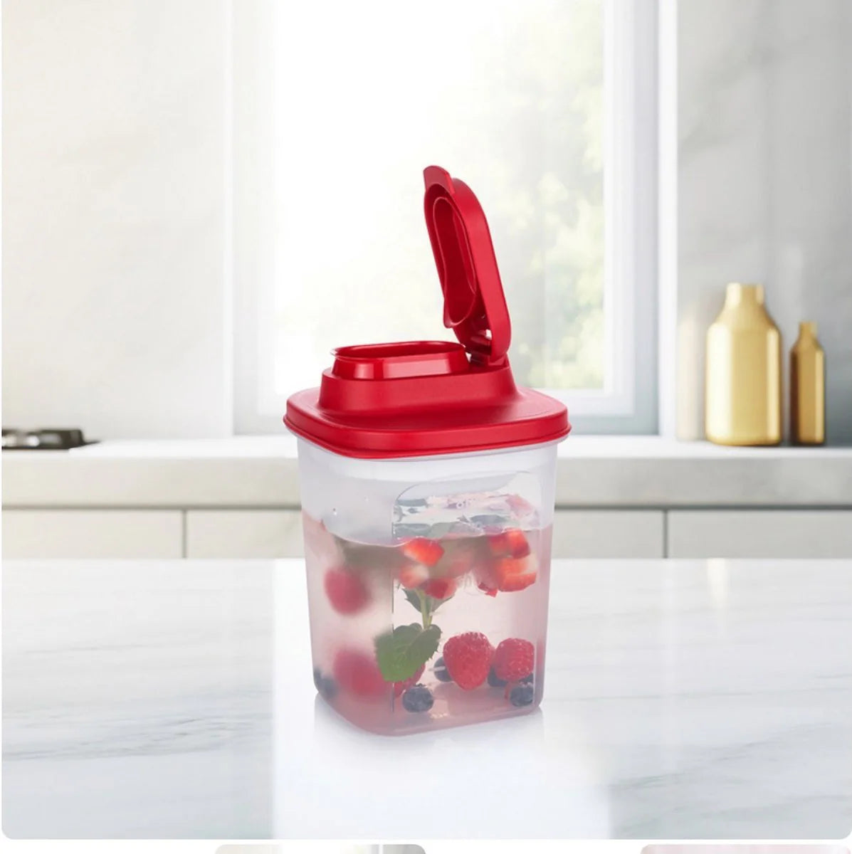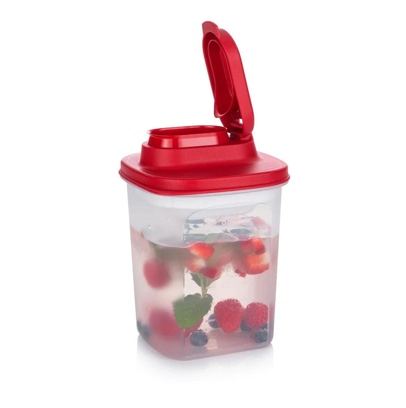 De koelkan van 1 l die in bijna alle koelkastdeuren past. De vierkante vorm maakt optimaal gebruik van de ruimte en de doorzichtige container laat meteen de inhoud zien.